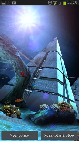 Поверить во все мною сказанное позволят высококачественные живые обои Atlantis 3D Pro Live Wallpaper. Реалистичная трехмерная графика полностью передает дух глубины. Вокруг затонувших пирамид растет многочисленное количество водорослей, а вокруг плавают разные виды рыб. Все играет яркими красками и несмотря на то, что сюжет разворачивается глубоко под водой, солнце отлично освещает дно и иногда даже слепит вас. В настройках можно включить либо выключить отображение элементов, тем самым снизить нагрузку на системные ресурсы.