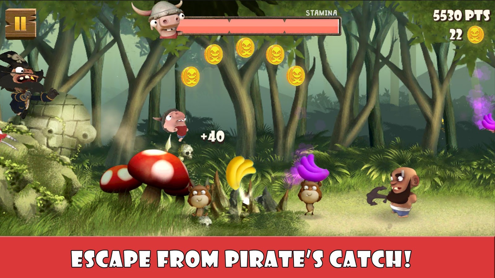 Задача Барти – прыгать по болотам, кишащим крокодилами, кустам и деревьям. Ни в коем случае нельзя оказаться на земле, сразу можно оказаться пойманным пиратами. Бананы – вот что любит бегемотик больше всего. Некоторые обезьяны помогают ему и срывают для него бананы, но не все особи готовы разделить с ним свою еду. Самый опасный враг для Барти – пиратский капитан, он ведет на него охоту. Еще одним необычным раннером является Rail Rush.