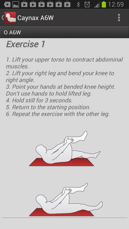 Интерфейс программы простой и понятный. К каждому упражнению имеется подробное описание и картинка, на которой показано, что и как делать. В настройках можно самостоятельно задавать темп выполнения. Всего данная программа рассчитана на 42 дня занятий. Для удобства в Caynax A6W присутствует календарь с отображением дня, количеством подходов и выполнения упражнения. Хотелось бы отметить, что данный комплекс предназначен для людей, не склонных к отложению жира и рассчитан для тех, кто просто хочет иметь красивый пресс.