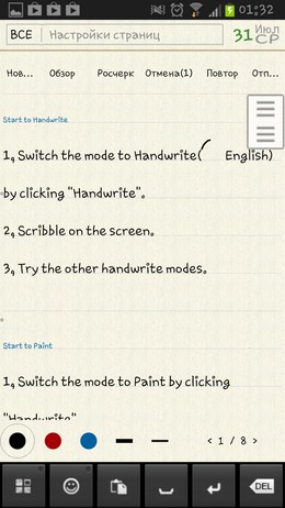 Примечательно приложение FreeNote тем, что в нем имеется возможность как клавиатурного ввода текста, так и рукописного, что делает работу с программой максимально простой и удобной. То есть вы можете выбрать один из имеющихся по умолчанию эскизов и на нем уже напечатать необходимый текст, либо же написать его вручную либо отметить каким-нибудь рисуночком, формулой и тому подобным, чего не позволяет сделать клавиатура. Также в заметки можно добавлять графические элементы, видео, аудио, голосовые записи. В программе есть календарь с напоминанием, список дел и будильник.
