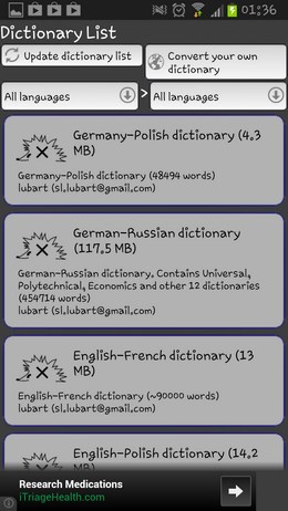 В программе имеется значительное количество словарей для перевода с одного языка на другой и обратно, среди которых французский, английский, немецкий, русский, украинский, китайский, таджикский, польский и другие. Пользователь может конвертировать и собственный словарь. Данный словарь очень прост в использовании и вы в пару кликов можете найти перевод того либо иного слова с примерами его использования. При первом запуске программы пользователь самостоятельно может выбрать языковые базы, которые ему нужны, а загрузка происходит на карту памяти.