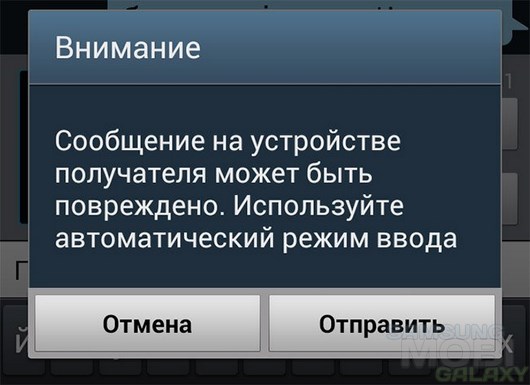 Одним из самых часто задаваемых вопросов на нашем сайте является вопрос о том, каким образом можно исправить ошибку “Сообщение на устройстве получателя может быть повреждено. Используйте автоматический режим ввода”, которая появляется во время ввода SMS-сообщений. Как показала статистика, такая “неполадка” очень часто беспокоит пользователей, который только приобрели Galaxy смартфон и не до конца разобрались с его функциями. Отправление сообщение на кириллице и игнорирование данного уведомления грозит тем, что получателю придет SMS, где вместо букв будут сплошные знаки вопроса.