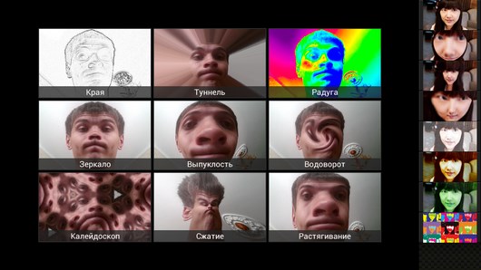 После запуска программы, вы активируете камеру и можете сделать фотографию с применением одного из предлагаемых эффектов: сужение, расширение, капля, призма и многие другие. Фото получаются смешные и занятные, посему вы с друзьями сможете провести время со смехом. В интерфейсе содержится три кнопки. Первая отвечает за смену фронтальной, задней камеры и выбор изображения из меню. С помощью второй можно выбрать сами эффекты, а третья позволяет изменить количество отображаемых окошек с разными эффектами. Кликнув по окошку, вы самостоятельно можете изменить насыщенность применяемого эффекта и провести другие действия с ним.