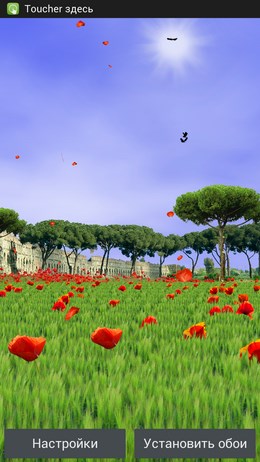 Весьма интересное украшательство для главного экрана, которое будет весьма актуально в любое время. Данная версия обоев является облегченной и абсолютно бесплатной, однако из-за этого большая часть настроек просто не доступна. В опциях вы можете задать количество растущих на поляне цветов красного мака, а также выбрать время суток, в которое вся представленная картина будет происходить. В небе будут летать птицы и в зависимости от времени суток сиять солнце, либо светить полная луна.