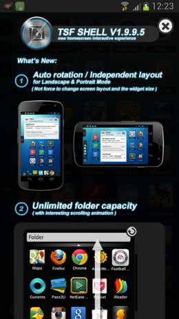 Если стандартный стиль оформления системы вашего Samsung Galaxy, мягко говоря, вам притерся, тогда стоит подумать об установке лаунчера, который смог бы изменить графический интерфейс девайса. В таком случае рекомендуем вам TSF Shell – приложение, после установки которого, вы просто не узнаете внешний вид системы. Данный лаунчер имеет собственные дополнительные темы и различные виджеты, которые являются уникальными и созданы именно для данного приложения.