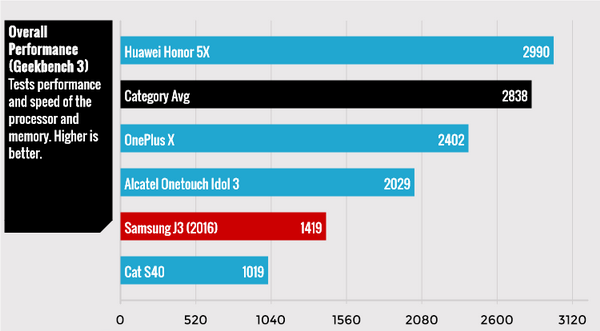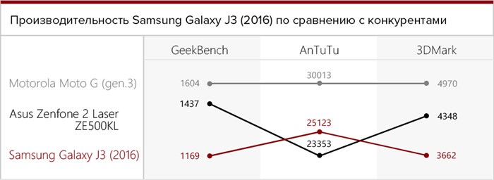 - В некоторых тестах Galaxy J3 показывает результаты более низкие, нежели его младшие собраться, например, Samsung Galaxy J1