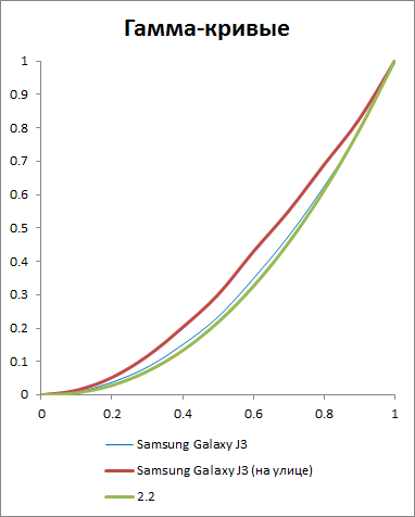 Вместе с тем в обновлённом Galaxy J3 теперь установлен дисплей типа Super AMOLED, а это значит, что, несмотря на слабую техническую подкованность, картинка на экране Galaxy J3 обещает быть довольно-таки качественной. Это сразу же видно по оценке точности цветопередачи, где ошибка Delta E составляет всего 2,7 при среднем показателе в 3,2.