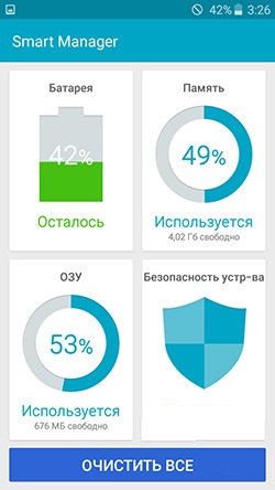 В стандартный набор приложений, предустановленных на Samsung Galaxy J3 2016, входит крайне полезный помощник под названием Smart Manager. Он позволяет своему владельцу легко и непринуждённо следить за основными процессами, происходящими в смартфоне. Например, контролировать уровень заряда, доступное количество памяти, загруженность ОЗУ, а также безопасность устройства.